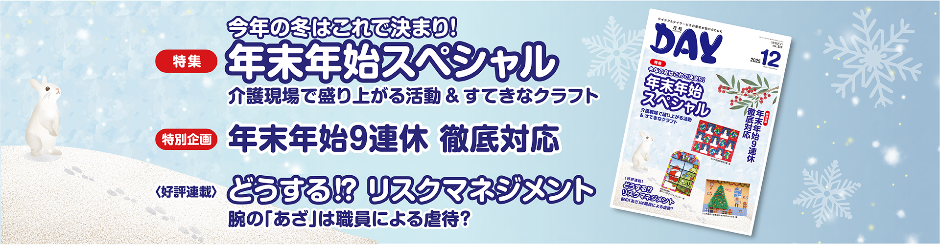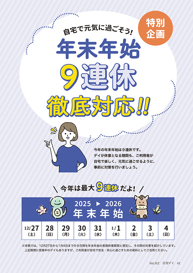 年末年始9連休徹底対応!!デイが休業となる年末年始は、ご利用者の身体機能の低下、体調不良などのトラブルが発生しやすくなります。ご利用者が自宅で楽しく、元気に過ごせるように、9連休の過ごし方をご紹介します。
