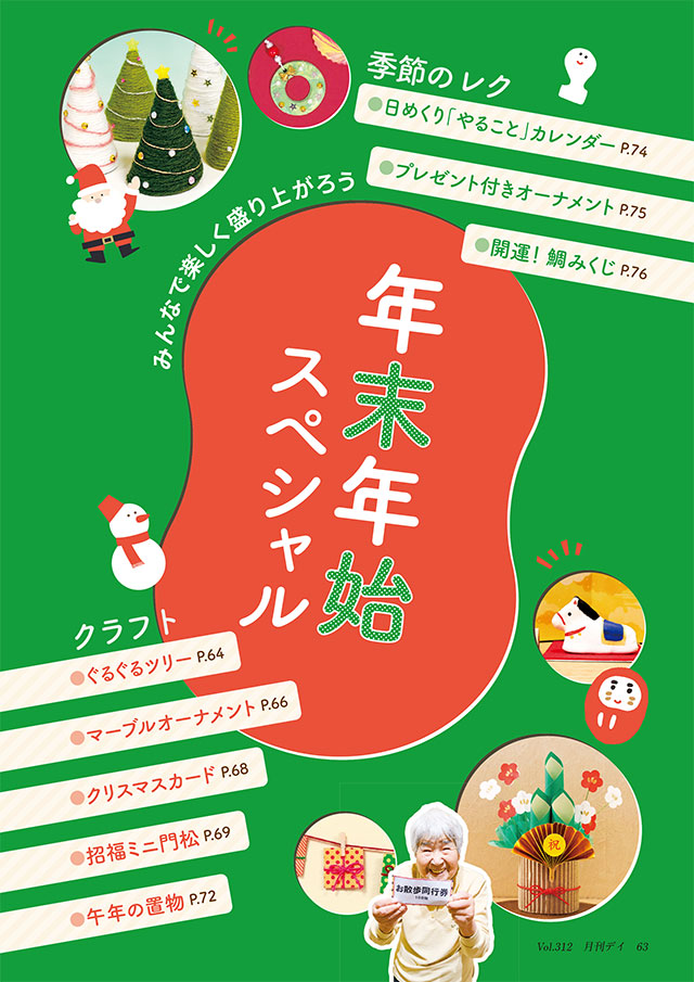 クリスマスからお正月まで、楽しいイベントが尽きない年末年始。クリスマスツリーや門松など季節の定番をモチーフにしたクラフトや、この時季ならではの特別感を味わえるレクのアイデアをご紹介します。今回の年末年始も充実した時間を過ごせること間違いなし!