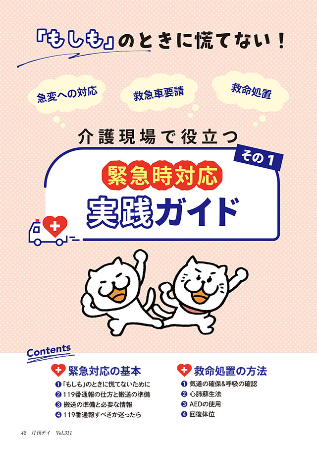 「デイの利用中にご利用者が突然倒れた」などの緊急時には、職員同士の連携と冷静な対応が求められます。いざというときのために、一人ひとりが知識を持ち、練習やシミュレーションをするなどして日頃から備えておくことが大切です。第1弾となる今回は、119番通報の仕方、搬送時に必要なもの・情報、119番通報に迷ったときの対処法、心肺蘇生などの救命処置のやり方などをご紹介します。