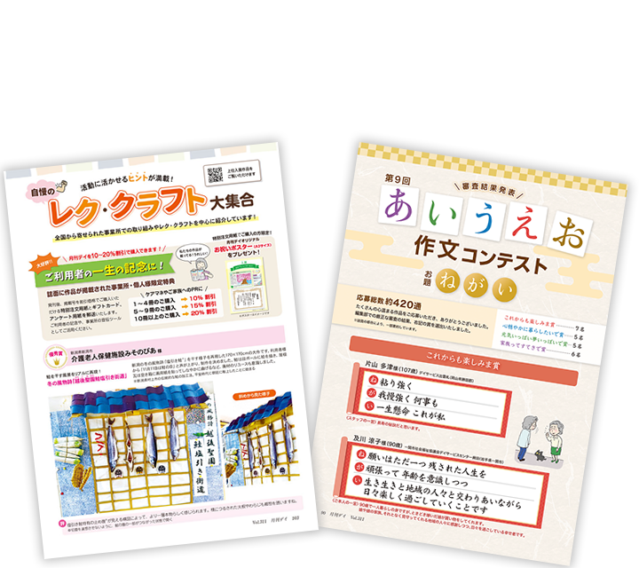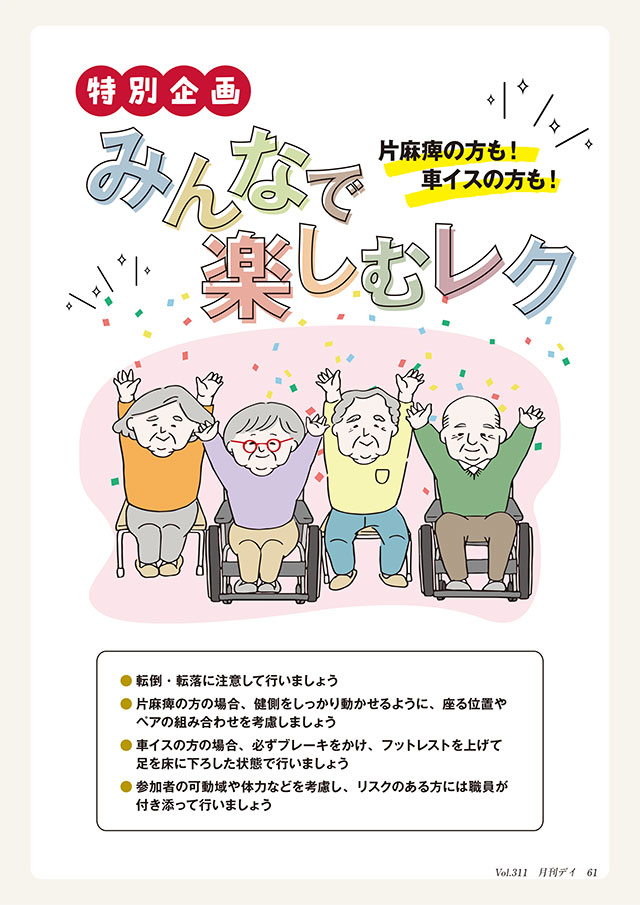 みんなで楽しむレク片麻痺の方や車イスの方も一緒に楽しめるレクを8種紹介。釣り上げやすくする、すくいやすくするためのポイントや道具の工夫、麻痺のない方はより体を動かせるアレンジ法も掲載しています。