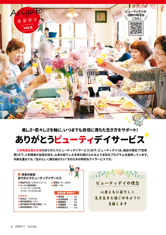 ご利用者が全員女性のありがとうビューティデイサービスは、食事、整容、機能訓練、口腔ケアなど、美しさ・若々しさを軸に多彩な活動を展開しています。その具体的なプログラムをご紹介します。