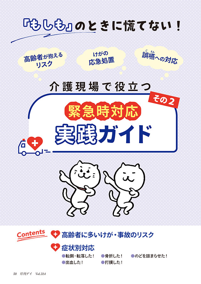 身体機能が低下した高齢者には、転倒・転落によるけがや食事中の窒息などのリスクがあります。いざというときのために、職員一人ひとりが知識を持ち、応急処置の練習やシミュレーションを行うなど、日頃から備えておくことが大切です。第2弾となる今回は、以下の事故・けがへの対応方法をご紹介します。