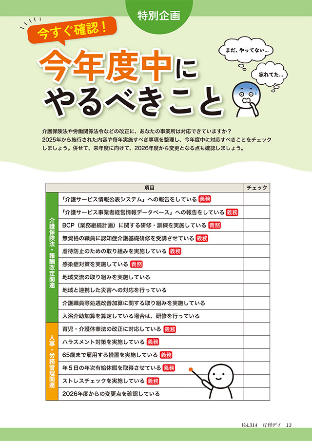 介護保険法や労働関係法令などの改正に、あなたの事業所は対応できていますか? 2025年から施行された内容や毎年実施すべき事項を整理し、今年度中に対応すべきことをチェックしましょう。