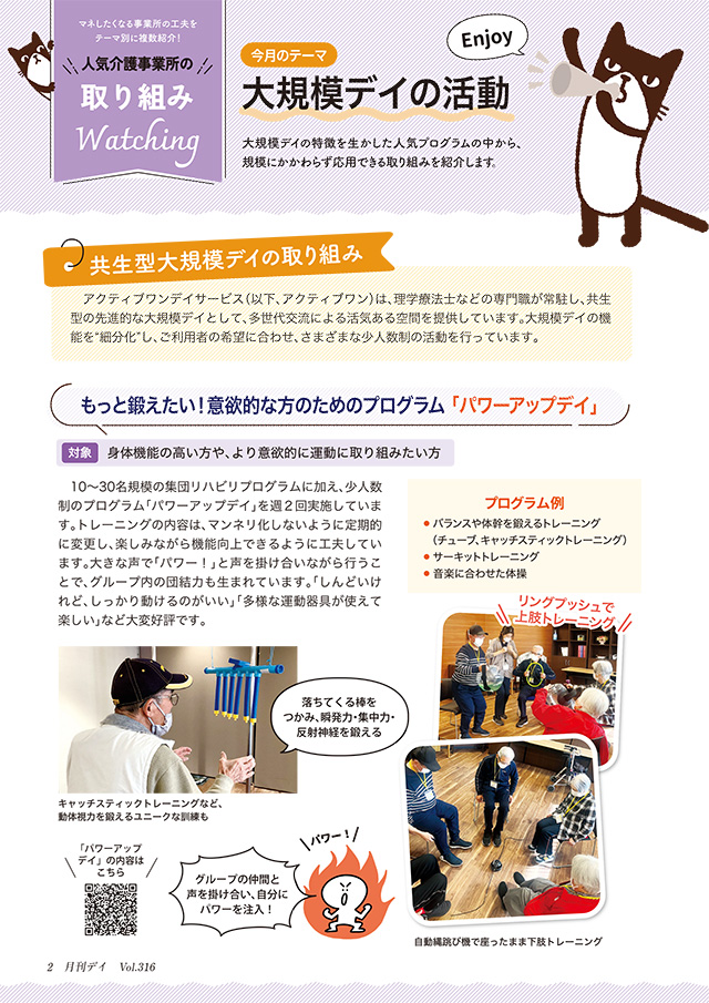 大規模デイの多様なご利用者の希望に寄り添い、少人数制の活動プログラムや自宅トレーニングの個別支援など、規模にかかわらず応用できる取り組みを行っている事業所を紹介します。